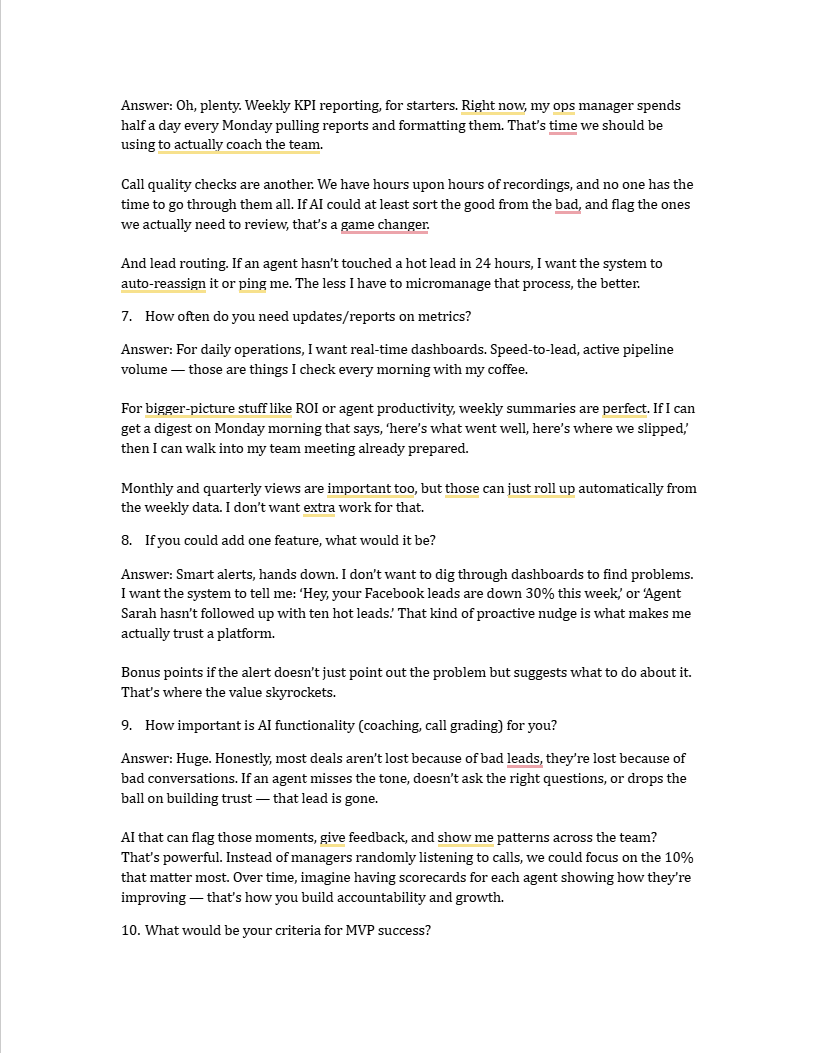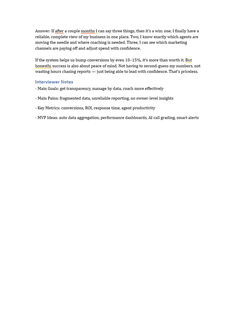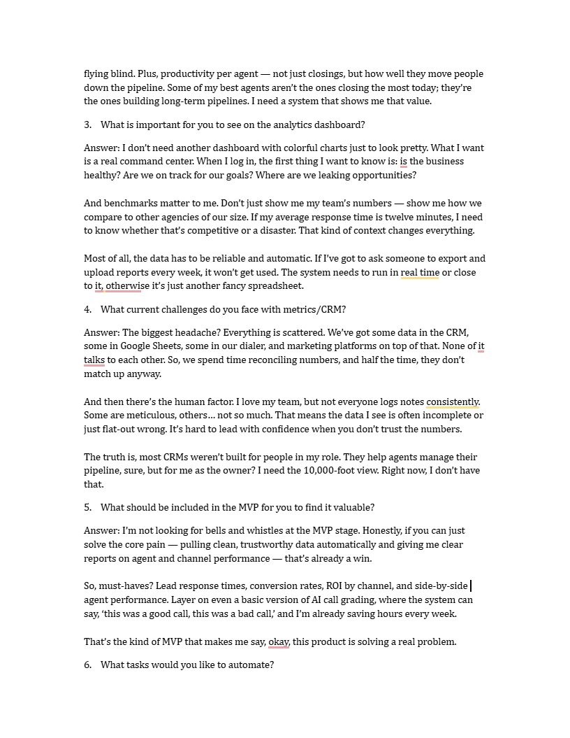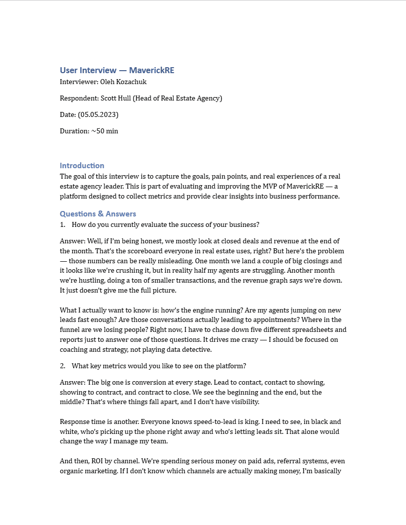 To validate assumptions and uncover real-world challenges, we conducted interviews with directors of large real estate agencies.