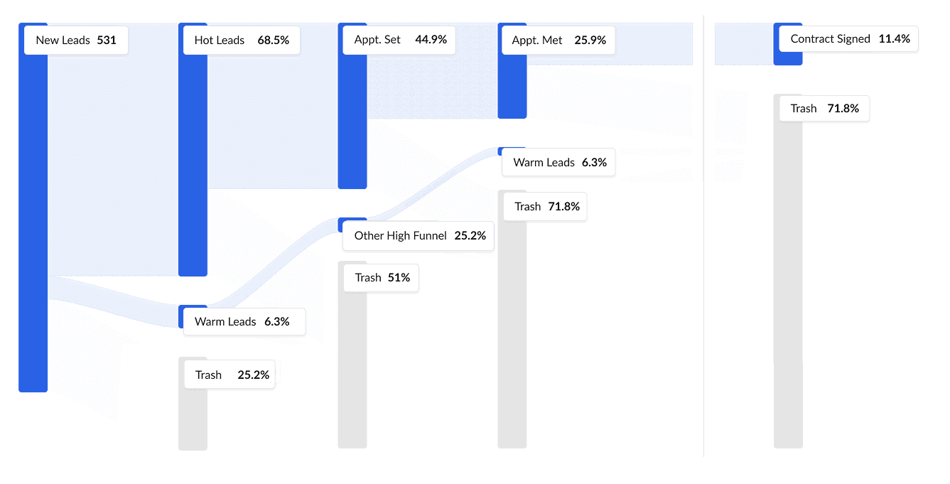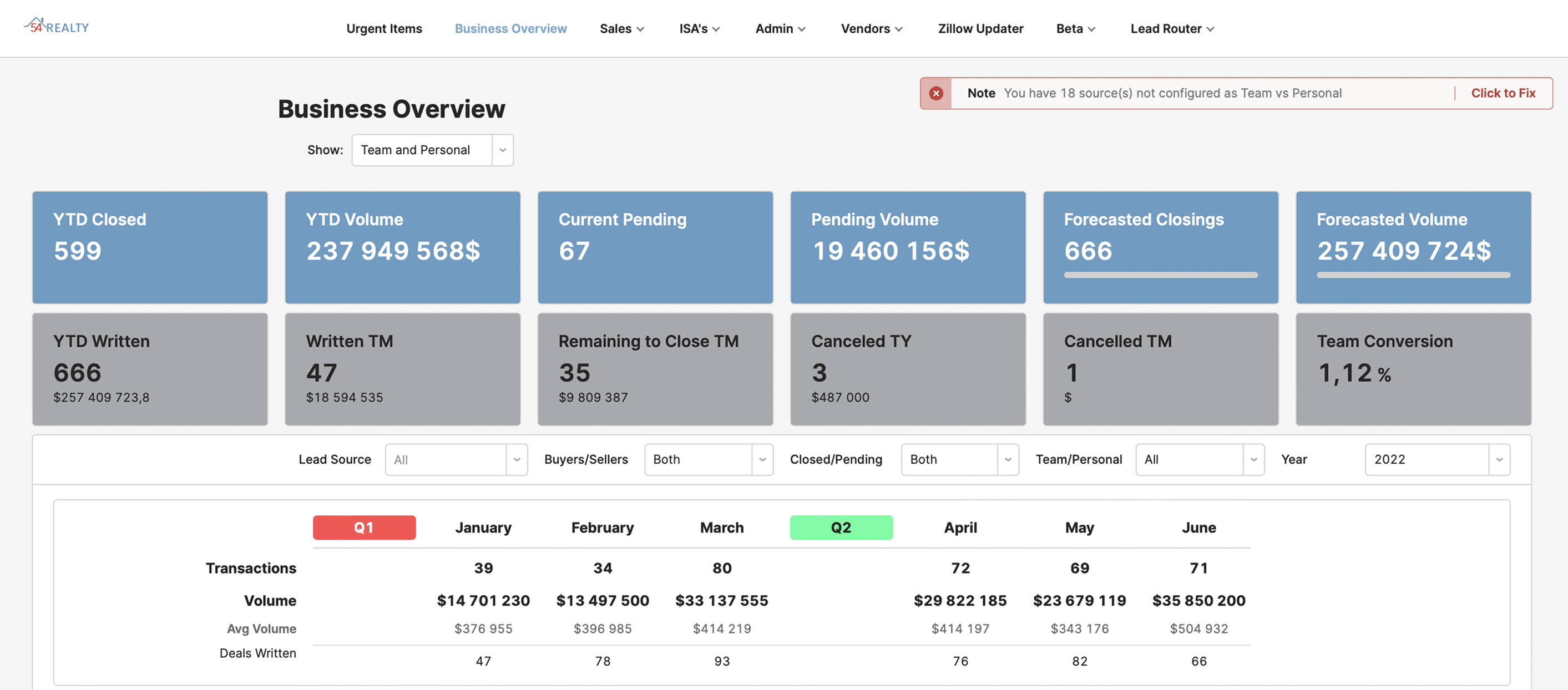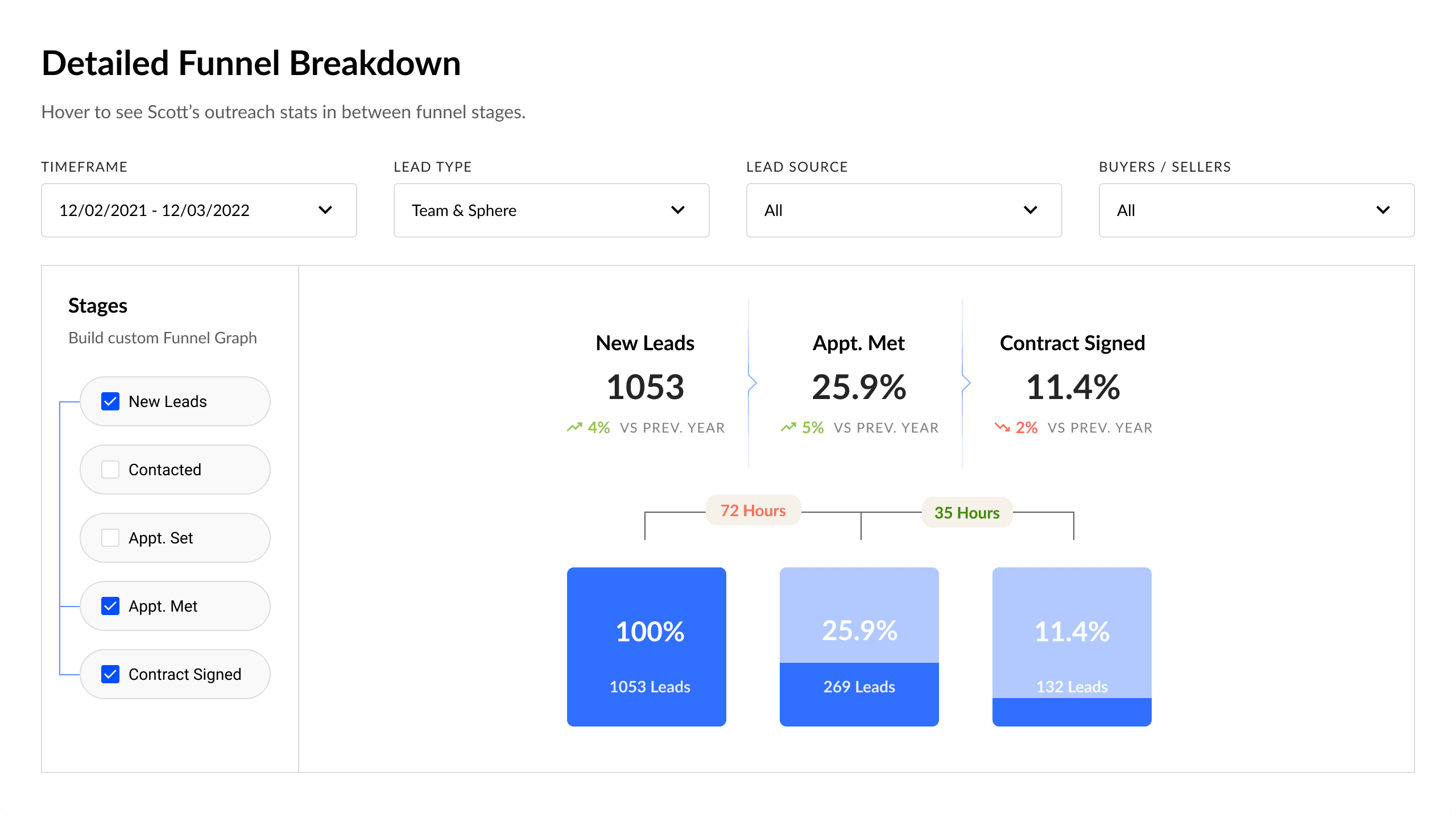 Filters (Timeframe, Lead Type, Lead Source, Buyers/Sellers) are applied before calculations. Result: users see only the stages that matter, while the metrics stay comparable and easy to read.