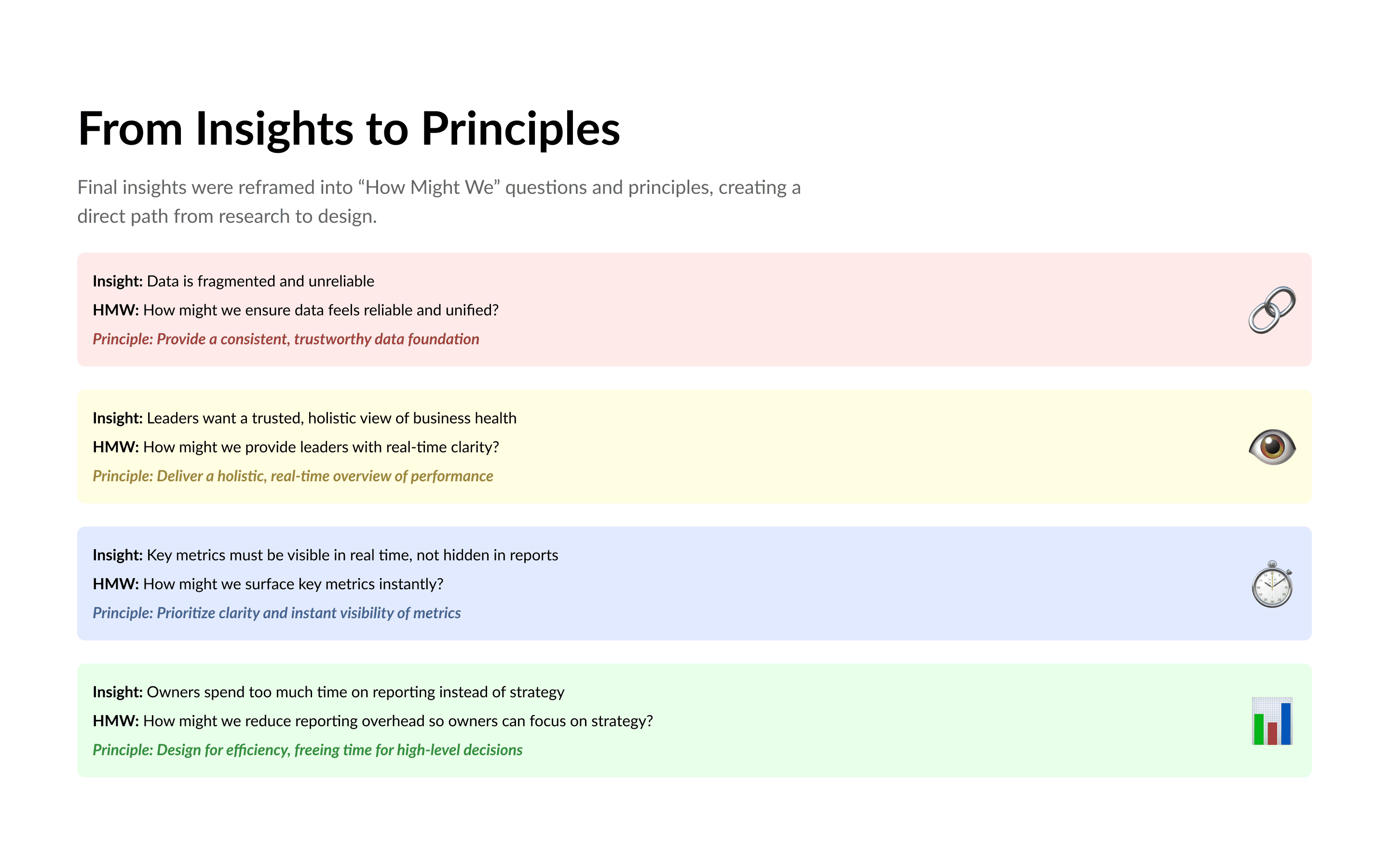 To connect research directly with design, I translated the final insights into “How Might We” questions and then derived guiding principles. This created a clear path from user pain points to actionable design decisions.
