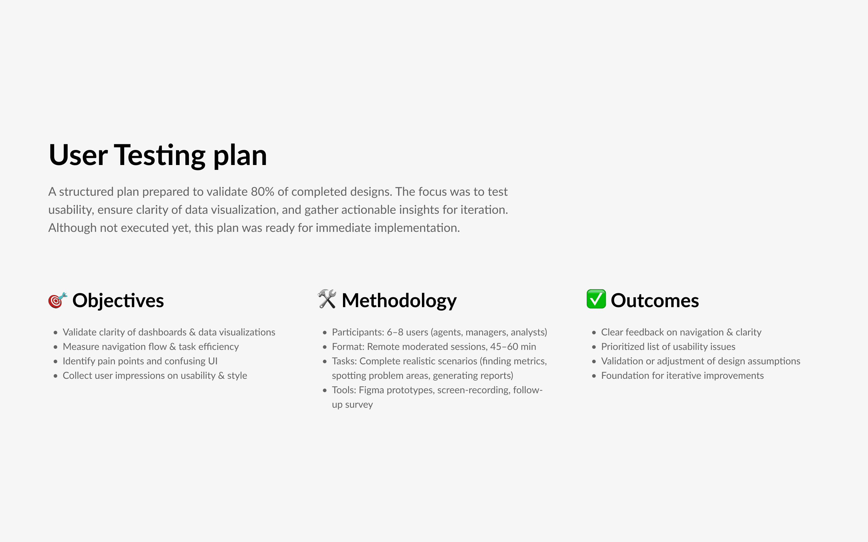 To ensure the usability and clarity of the product, I prepared a structured User Testing Plan once around 80% of the designs were complete. The goal was to validate our assumptions, uncover potential usability issues, and make sure the dashboards and visualizations would be intuitive for real users. Although the plan wasn’t executed at this stage, it was ready for implementation and served as a foundation for the next iteration cycle.